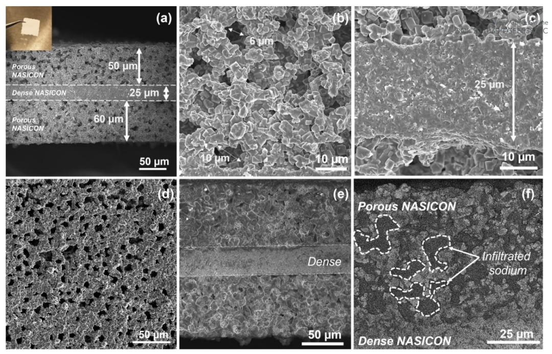 圖 2 (a) 燒結(jié)后雙摻雜 NASICON 三層結(jié)構(gòu)的橫截面掃描電子顯微鏡 (b)多孔層、(c) 致密層和 (d) 頂面圖像((a) 中的插圖顯示了三層結(jié)構(gòu)的光學(xué)圖像)。鈉滲入雙摻雜 NASICON 三層結(jié)構(gòu)的橫截面(e)二次電子圖像和(f)背散射電子圖像(放大區(qū)域)((f)中的標(biāo)記說(shuō)明了鈉填充區(qū)域)。