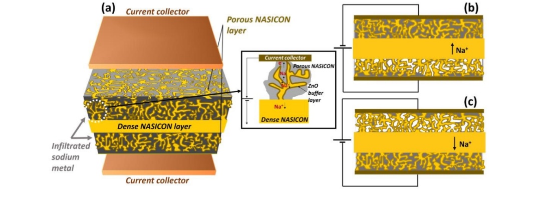 在此,研究人員展示了多孔-密孔三層結(jié)構(gòu)的制造方法。這些設(shè)計(jì)提高了 SSSB 的能量密度(通過(guò)減少 SE 厚度),并最大限度地降低了陽(yáng)極-電解質(zhì)界面電阻(與平面幾何形狀相比,鈉-NASICON 表面接觸面積增大)。多孔層可提高機(jī)械強(qiáng)度,并作為電極材料的三維網(wǎng)絡(luò)基體,確保電池在循環(huán)過(guò)程中無(wú)縫接觸。薄致密層起到隔離作用,防止活性電極成分?jǐn)U散。