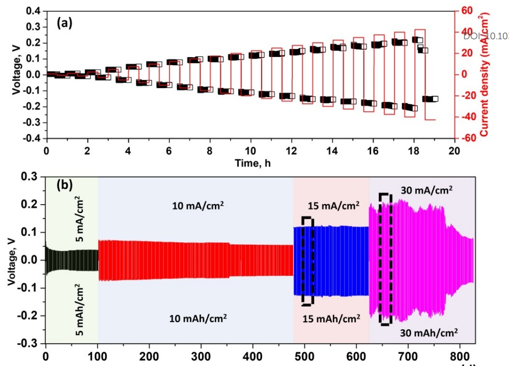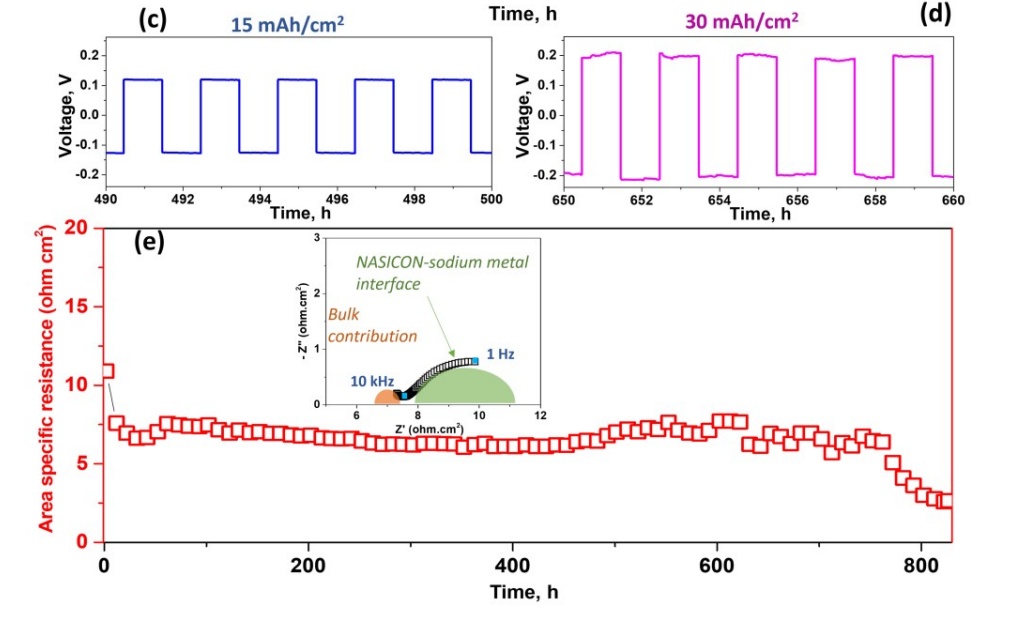 圖 4 (a) 在室溫和無(wú)疊層壓力條件下,摻雜鋅、鎂的 NASICON 三層對(duì)稱電池對(duì) CCD 測(cè)試的電位響應(yīng)。(b)鈉對(duì)稱電池在室溫下的電流密度為 5、10、15 和 30 mA/cm2 時(shí)的電恒流循環(huán),每個(gè)循環(huán)測(cè)量 1 小時(shí)。在 (c) 15 mA/cm2 和 (d) 30 mA/cm2 下記錄的鈉循環(huán)放大電壓曲線。(e) 在 5、10、15 和 30 mA/cm2 下進(jìn)行電恒流循環(huán)時(shí)對(duì)稱電池的面積比電阻變化(插圖為鈉對(duì)稱電池在電恒流循環(huán)前的Nyquist圖)