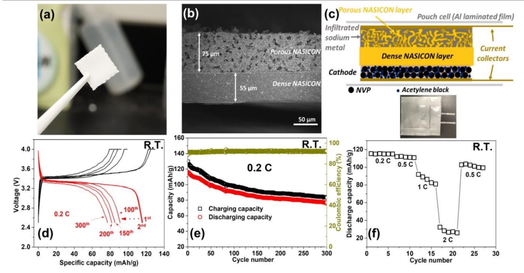 圖 6 (a) 摻雜鋅鎂的 NASICON 雙層材料的光學(xué)圖像和 (b) 截面掃描電子顯微鏡圖像。(c) 軟包電池的示意圖和圖片,(d) 充放電曲線,(e) 循環(huán)性能(0.2 C 時(shí)),(f) 在室溫下測(cè)量的 NVP/Zn,Mg 摻雜 NASICON/Na 的速率能力測(cè)試。