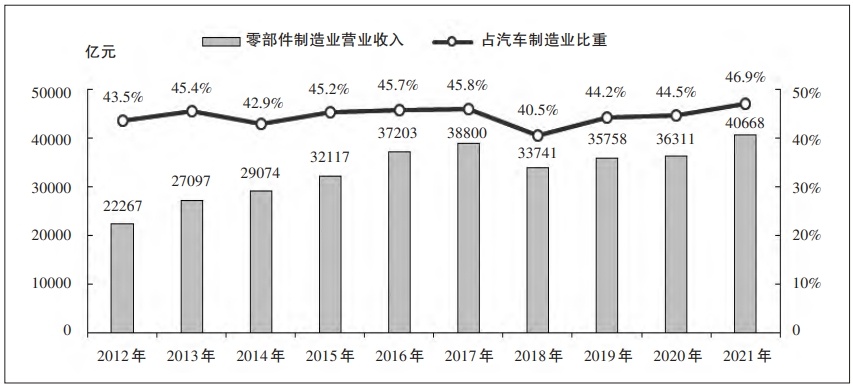 2012-2021年中國零部件制造業營收規模及利潤總額