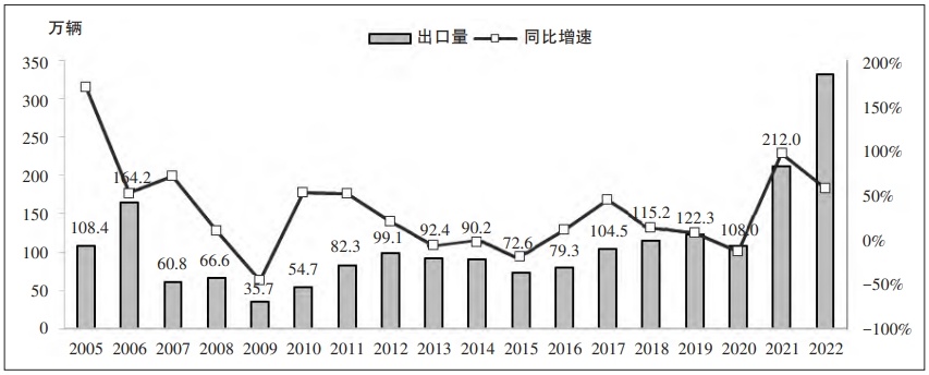 近幾年,我國汽車出口繼續保持較高水平,車企加速開拓海外市場。根據海關總署數據統計,2022年我國汽車(含底盤)出口332.0萬輛,同比增長56.8%,自2021年首次突破200萬輛大關之后,再度跨越300萬輛水平,汽車出口繼續保持較高水平。