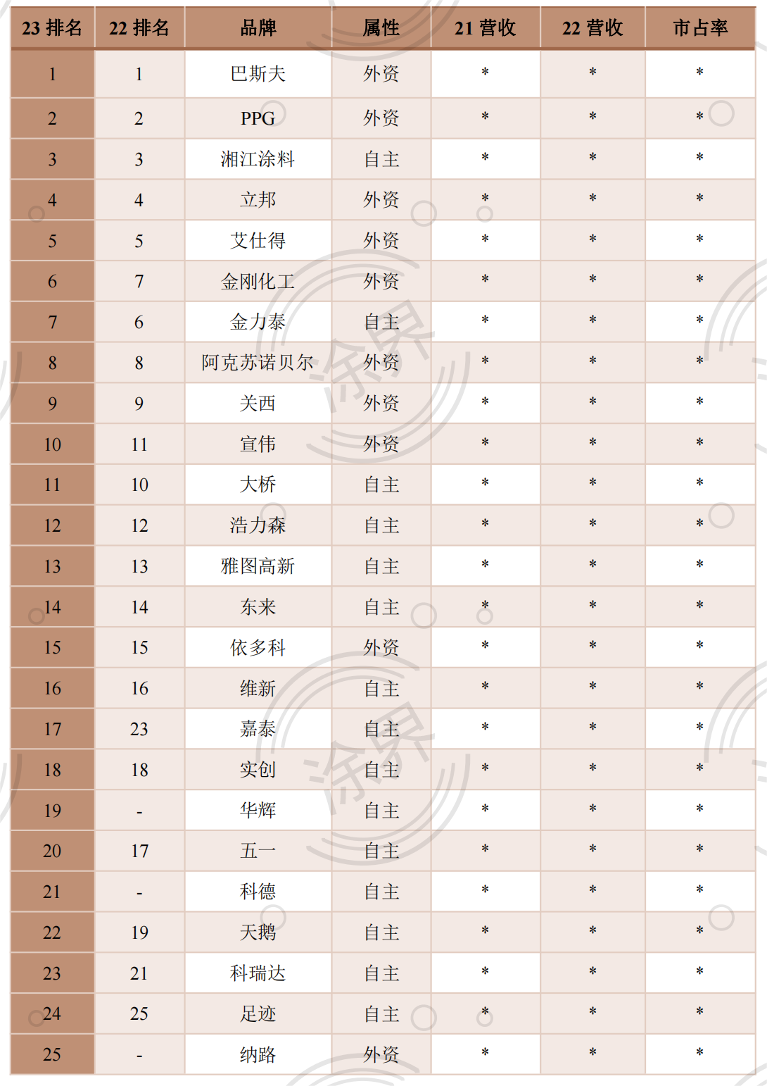 2023年10月23日,國內涂料產業專業財經媒體《涂界》(Coatings World)發布“2023中國汽車涂料品牌TOP25”榜單,榜單匯聚了國內最具影響力的汽車涂料品牌。榜單主要基于品牌2022年汽車涂料(含乘用車涂料、商用車涂料、新能源汽車動力電池涂料、汽車修補漆,不含摩托車涂料、軌道交通裝備涂料、工程機械涂料等)業務銷售收入進行排名。