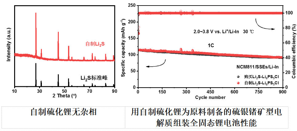 采用獨創(chuàng)的新型硫化鋰合成方法,可大幅降低制備硫化物電解質(zhì)所需主要原料的成本,使用自制硫化鋰與市場購買高純硫化鋰制備出的典型硫銀鍺礦型硫化物電解質(zhì)組裝的全固態(tài)鋰電池性能相當。