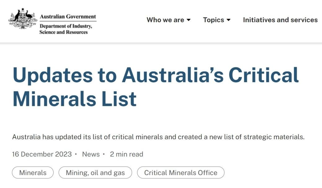澳大利亞產業、科學和資源部發布公告稱,對今年6月設立的關鍵礦物清單進行調整,同時追加設立了一份“戰略礦物清單”。