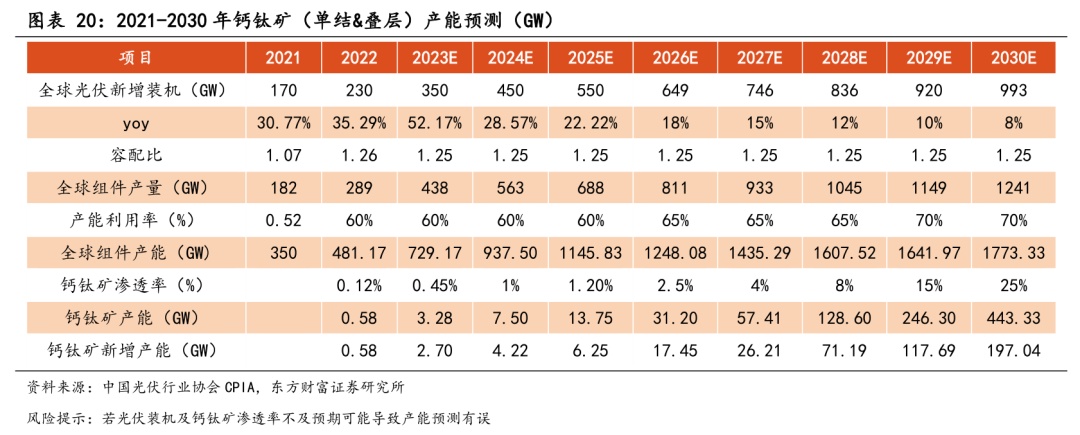 3)假設2022-2030年鈣鈦礦滲透率逐步由0.12%提升至25%;