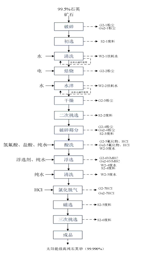 項(xiàng)目總投資20000萬元,新上2條生產(chǎn)線,包括送料機(jī)、破碎機(jī)、除塵設(shè)備、煅燒爐、反應(yīng)釜、多級(jí)浮選機(jī)、烘干機(jī)、磁選機(jī)、振動(dòng)篩等設(shè)備,采用石英礦石—破碎—初選—清洗—焙燒—水淬—干燥—二次挑選—破碎篩分—酸洗—浮選—清洗—氯化脫氣—磁選—三次挑選—成品等工藝流程,形成年產(chǎn)10000噸高純石英砂的生產(chǎn)能力,其中電子級(jí)高純石英砂4000噸/年,太陽能級(jí)高純石英砂6000噸/年。