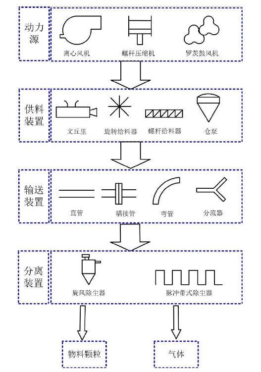 氣力輸送系統主要由四部分組成:動力源、供料裝置、輸送裝置、分離裝置,每個部分都需要專用硬件設備來實現所需的要求。進行一次完整的氣力輸送,需要依次完成:動力源提供壓縮氣流—供料器供給物料顆粒—輸送裝置完成管道運輸與分流—分離裝置將物料顆粒與氣流分離。