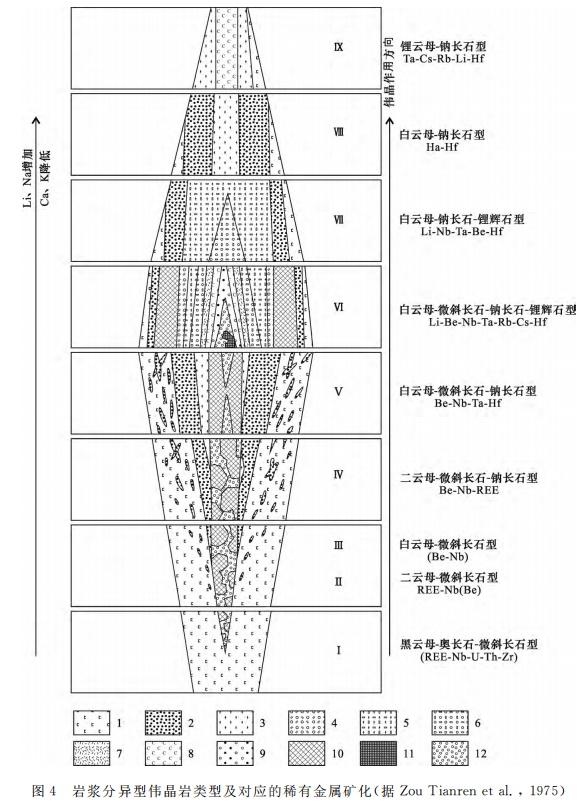 國際上存在不同的偉晶巖分類,Buddington提出基于偉晶巖形成深度的劃分方案,金茲堡也主要根據形成深度,把花崗偉晶巖劃分為深成、白云母、稀有及晶洞偉晶巖等類型。H.A.索洛多夫根據造巖礦物組成把偉晶巖分為微斜長石型、微斜長石-鈉長石型、鈉長石型和鈉長石-鋰輝石型等偉晶巖。我國偉晶巖學者采用了索洛多夫的分類方案。