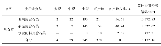 我國脈石英礦產資源分布廣泛,局部較為集中,主要分布在江西、四川、安徽、黑龍江、新疆、陜西、浙江7個省份,礦床規(guī)模以小型為主,占脈石英礦床總數的91.27%。