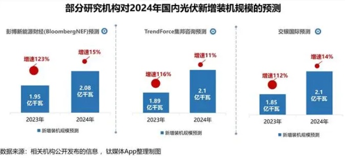 產能、技術之外,市場需求問題也是繞不開的話題,鈦媒體APP在此前的光伏產業展望中曾提及,多家機構均預測2024年我國光伏需求增速將大幅放緩,彭博新能源財經、集邦咨詢、交銀國際的2024年新增裝機增速預測均未超過15%(2023年增速超過100%);而從全球來看,對光伏裝機增速的預測也從2023年的超過60%降為了2024年的普遍低于30%。