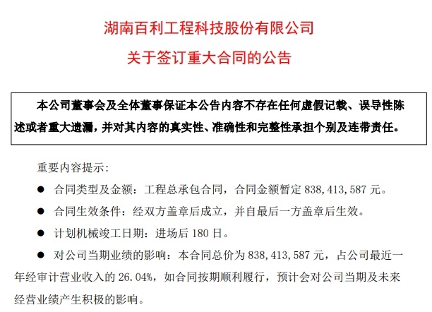 根據(jù)公告,該合同暫定總價(jià)為8.38億元,占公司最近一年經(jīng)審計(jì)營業(yè)收入的26.04%。如果合同能夠按期順利履行,預(yù)計(jì)將對(duì)百利科技的當(dāng)期及未來經(jīng)營業(yè)績產(chǎn)生積極的影響。