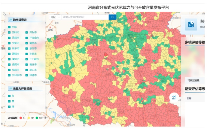 其中,河南明確分布式光伏開發紅、黃、綠區域,按季度向社會公布,并適時縮短測算公布周期;優先支持綠色區域內的分布式光伏項目,黃色、紅色區域內的分布式光伏項目,待落實消納條件后,再行開發建設。根據河南省能源大數據中心公布的情況,河南不同區域的承載力情況如下圖所示,河南整體上已經處于紅黃狀態,綠色區域較小。