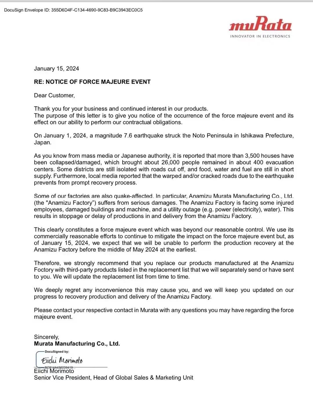樹脂多層基板制造/研發(fā)據(jù)點「Wakura村田制作所」復工時間待定;