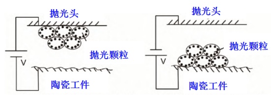 電泳拋光是一種極具潛力的非接觸的拋光方法之一,該技術利用帶電粒子在電場中移動速度不同而達到分離。下圖是電泳拋光原理示意圖,圖(a)中陶瓷工件端為負極,拋光頭為正極時,拋光粒子在電場力作用下向拋光頭聚集,形成一個柔性磨粒層,當陶瓷工件旋轉(zhuǎn)時,磨料與工件間會發(fā)生摩擦和碰撞,進而達到拋光的目的。圖(b)中陶瓷工件為正極,拋光頭為負極時,拋光粒子將在電場作用下向工件方向聚集,陶瓷工件和拋光頭相對運動,拋光粒子對工件表面產(chǎn)生沖擊碰撞,從而達到去除材料的目的。由于這種方法幾乎對加工表面不產(chǎn)生機械加工常見的損傷,故最適合于功能陶瓷的超精密加工。
