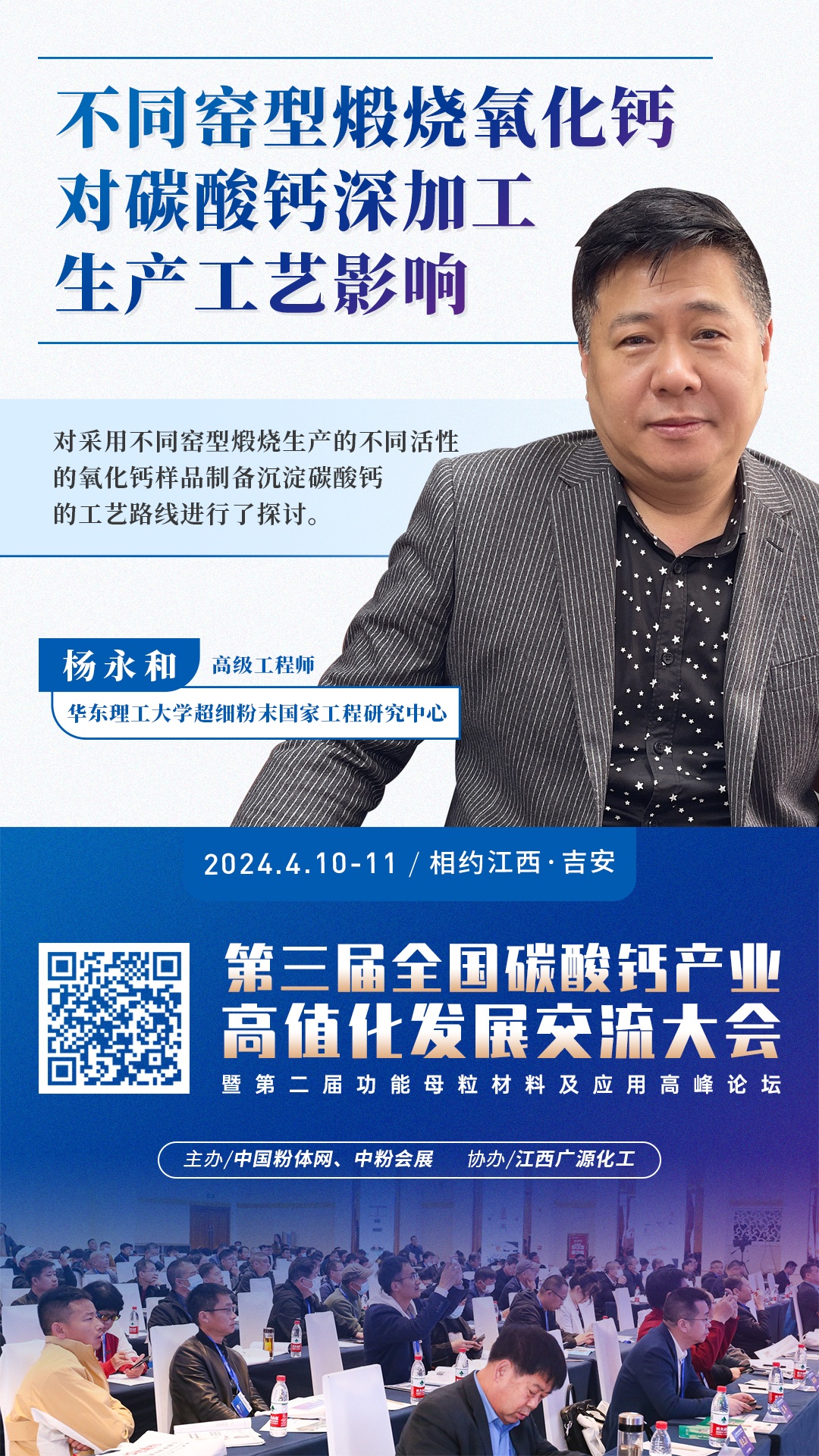 2024年4月10日~11日,第三屆全國碳酸鈣產業高值化發展交流大會將在江西·吉安舉行,屆時華東理工大學超細粉末國家工程研究中心高級工程師楊永和將在大會上作《不同窯型煅燒氧化鈣對碳酸鈣深加工生產工藝影響》主題報告,對采用不同窯型煅燒生產的不同活性的氧化鈣樣品制備沉淀碳酸鈣的工藝路線進行探討,研究匯報氧化鈣活性對普通輕質碳酸鈣和納米碳酸鈣生產以及應用的影響。