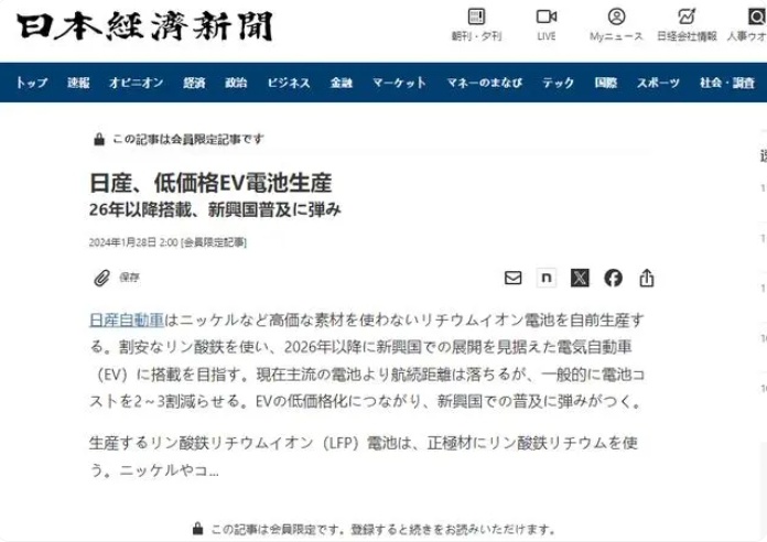 中國粉體網(wǎng)訊 據(jù)日經(jīng)新聞,日產(chǎn)汽車計劃為電動汽車生產(chǎn)磷酸鐵鋰(LFP)電池,目前正在日本神奈川縣厚木市的研發(fā)機構(gòu)開發(fā),預(yù)計從 2026 財年起向新興市場出貨。
