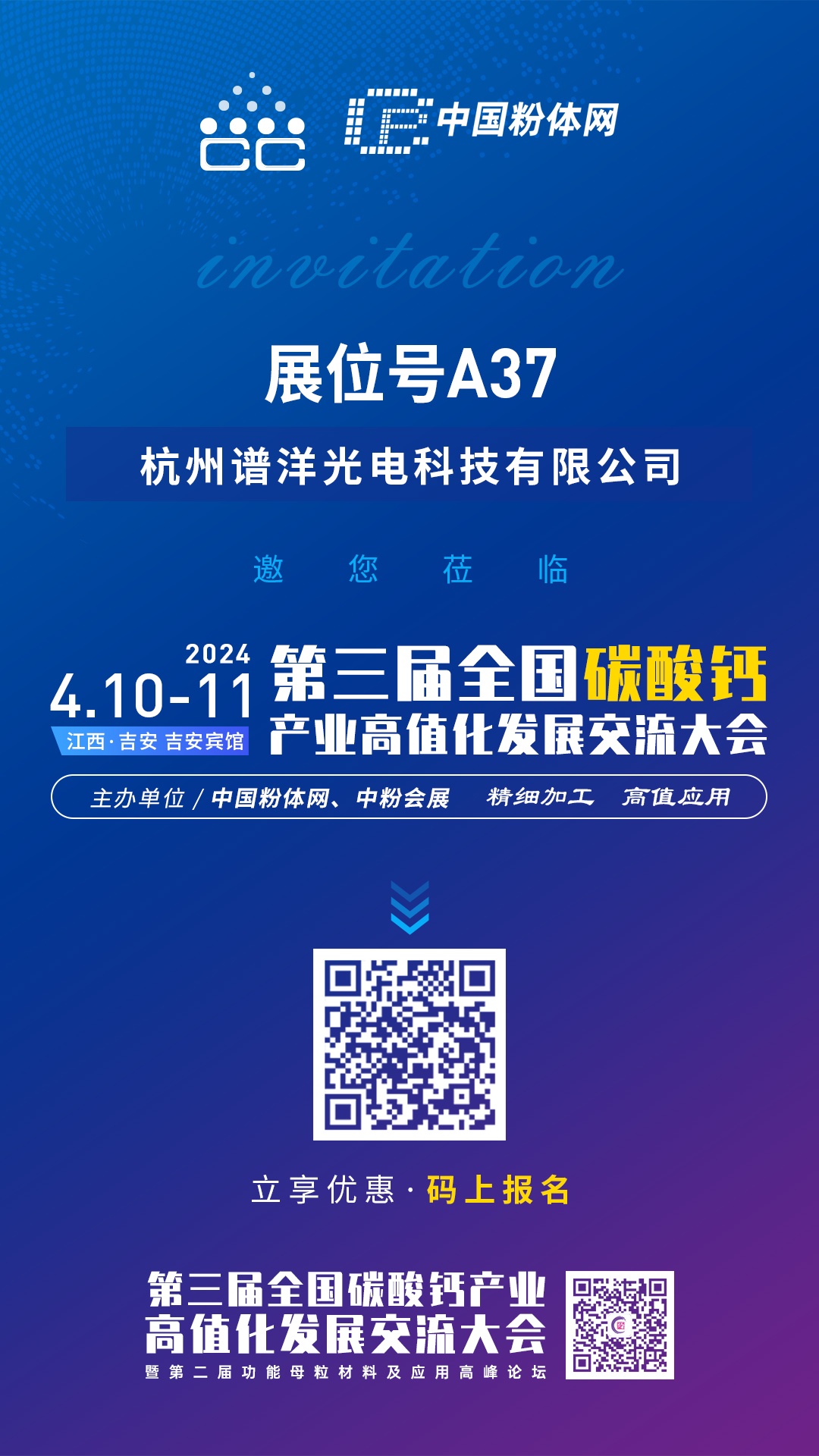 由中國粉體網主辦的“2024第三屆全國碳酸鈣交流會”將于2024年4月10-11號在江西吉安舉辦,杭州譜洋光電科技有限公司邀您一同參加。