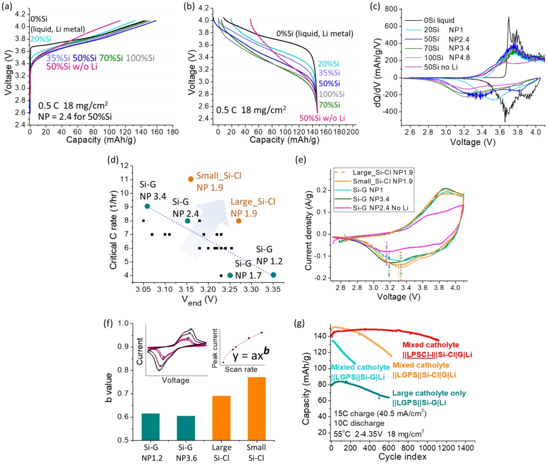 圖4a-c是以硅-石墨|鋰金屬(Si-G|Li)為負極的充放電電壓曲線與dQ/dV分析,從中得出放電曲線終點附近的拐點電壓與基于硅負極容量計算的名義上的NP值成負相關。在測量了不同NP值,以及相同NP值下不同元素與硅混合后的臨界短路倍率(C-rate)之后,我們發現了臨界短路C-rate和0.3C拐點電壓的負相關關系(圖4d)。從電池性能的角度來說,兩者都是越高越好。而Si-Cl負極可以突破原有的負相關區域,同時達到高的臨界短路C-rate和電壓(圖4d,e)。在動力學指標b值的測量中,Si-Cl負極相對于Si-G負極有顯著提升。