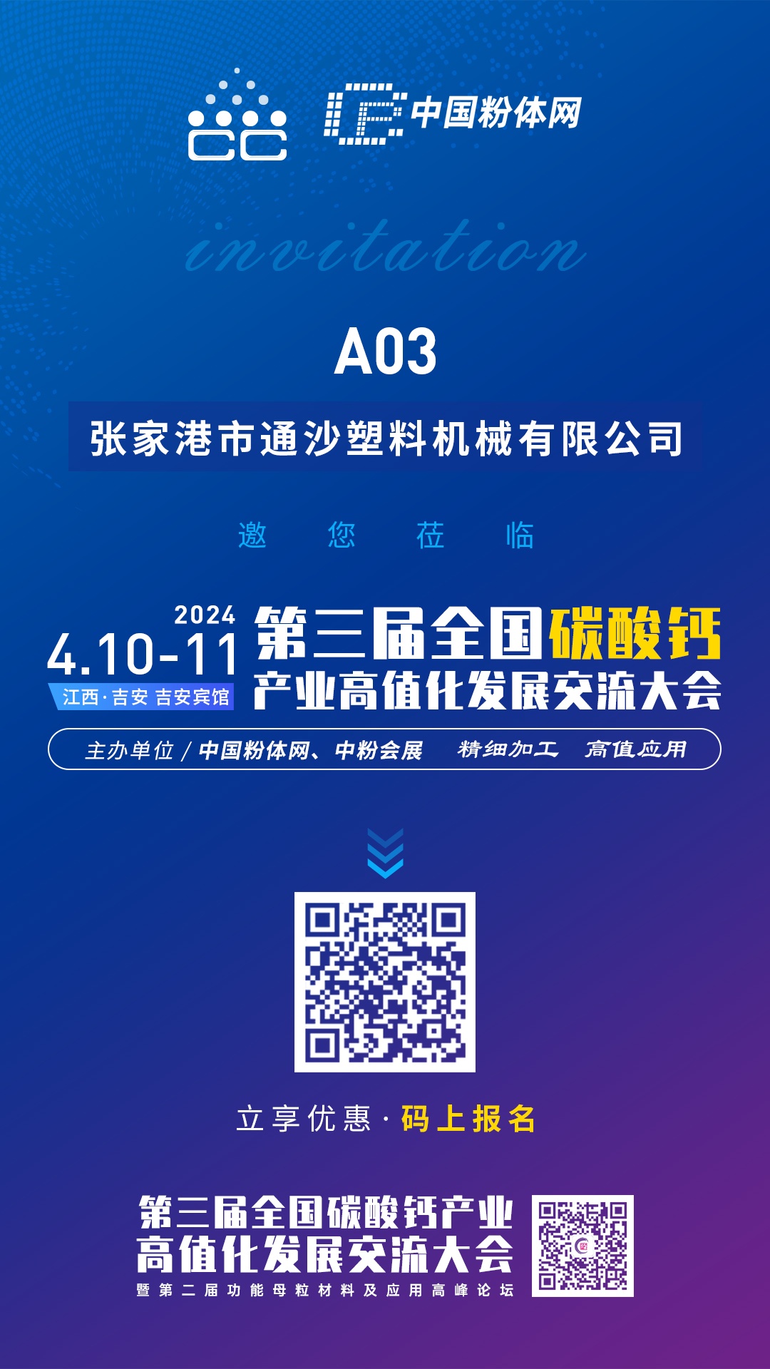 由中國粉體網主辦的“2024第三屆全國碳酸鈣交流會”將于2024年4月10-11號在江西吉安舉辦,張家港市通沙塑料機械有限公司邀您一同參加。