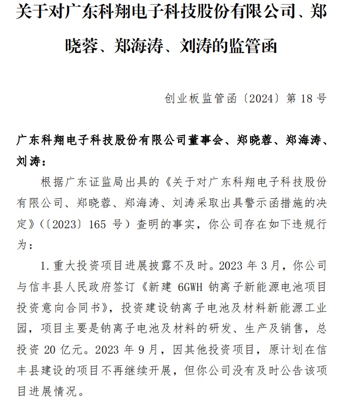 中國粉體網訊 2月20日,深交所對科翔股份及董事長兼總經理鄭曉蓉、董秘鄭海濤、財務總監劉濤下發了監管函,指出公司存在重大投資項目進展披露不及時、未披露并購子公司對外擔保情況的違規行為。