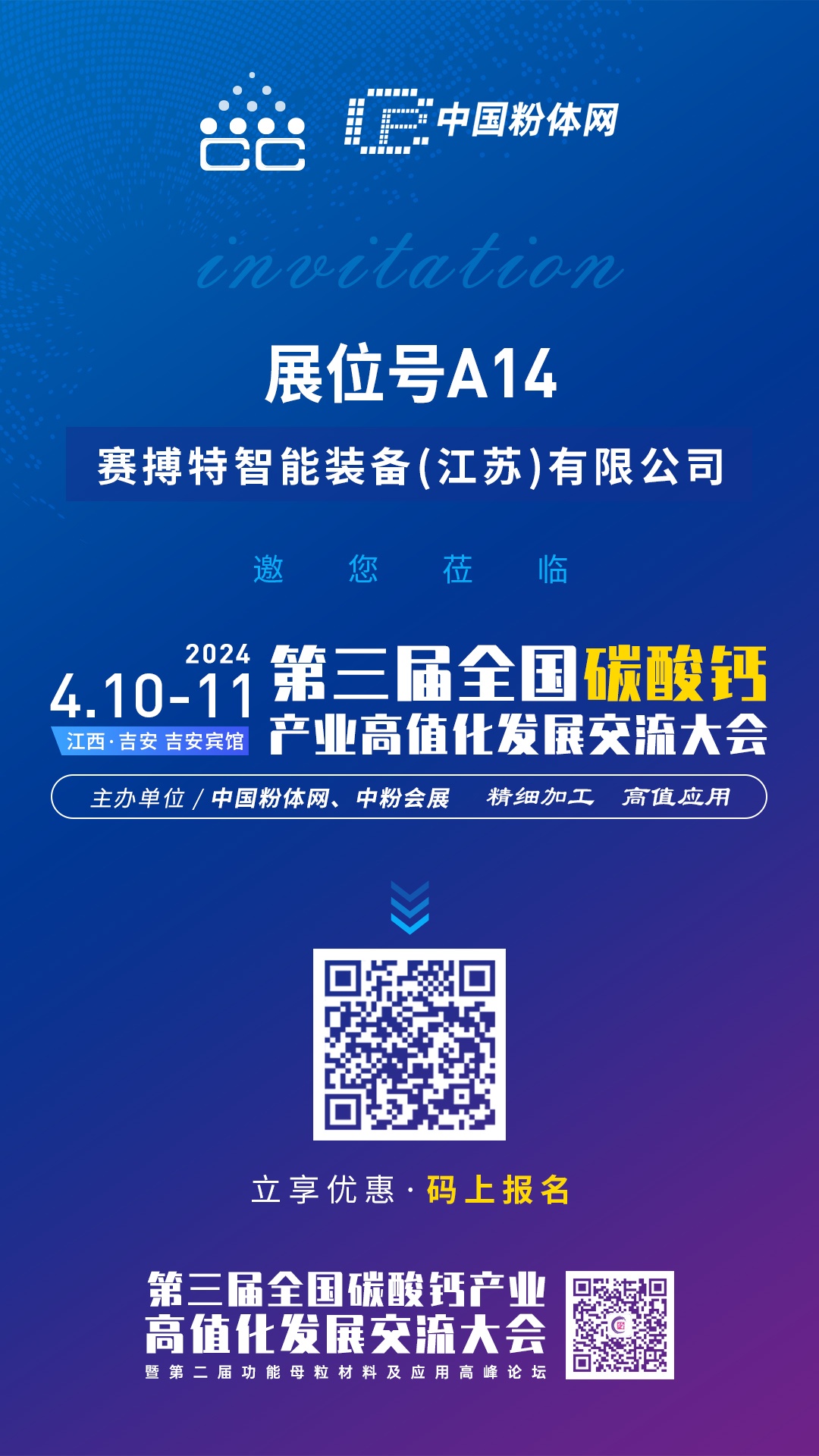 由中國粉體網主辦的“2024第三屆全國碳酸鈣交流會”將于2024年4月10-11號在江西吉安舉辦,賽搏特智能裝備(江蘇)有限公司邀您一同參加。