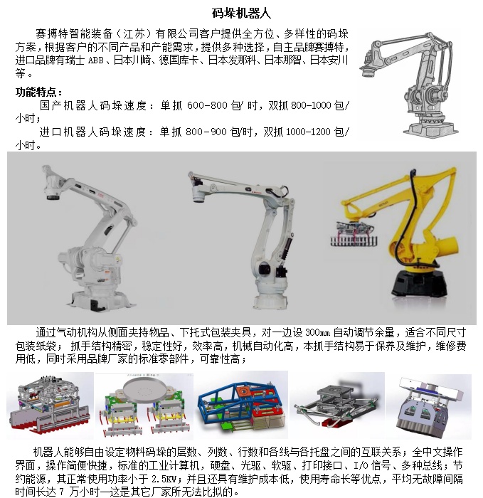 賽搏特智能裝備(江蘇)有限公司是研發、生產、銷售后道包裝機、碼垛機器人以及注塑機械手等,產品廣泛適用精細化工、干粉砂漿、膩子粉、涂料、糧油、面粉、飼料、肥料、食品、飲料、飲料、醫藥等行業。