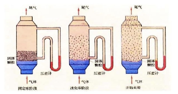 將一批固體顆粒堆放在多孔的分布板上形成床層,使流體自下而上通過床層。由于流體的流動及其與顆粒表面的摩擦,造成流體通過床層的壓力降。當流體通過床層的表觀流速(按床層截面計算的流速)不大時,顆粒之間仍保持靜止和互相接觸,這種床層稱為固定床。當表觀流速增大至起始流化速度時,床層壓力降等于單位分布板面積上的顆粒浮重(顆粒的重力減去同體積流體的重力),這時顆粒不再相互支撐,并開始懸浮在流體之中。進一步提高表觀流速,床層隨之膨脹,床層壓力降近乎不變,但床層中顆粒的運動加劇。這時的床層稱為流化床。當表觀流速增加到等于顆粒的自由沉降速度時,所有顆粒都被流體帶走,而流態(tài)化過程進入輸送階段。