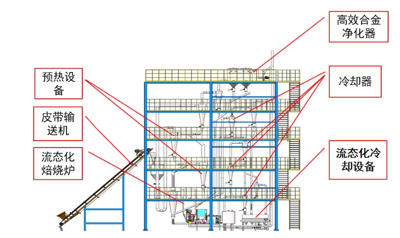 3、物料焙燒:來自高效合金凈化器和預(yù)熱過濾器捕集下的物料經(jīng)過管路輸送,與二級物料預(yù)熱器預(yù)熱后的物料一起進入到流態(tài)化焙燒爐中進行高溫焙燒。焙燒完成后的物料隨熱氣流進入焙燒分離器中,生產(chǎn)物料在焙燒分離器中得到分離。