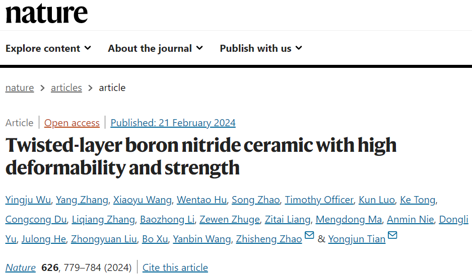 中國粉體網訊 2024年2月21日,燕山大學趙智勝及田永君共同通訊在Nature在線發表題為“Twisted-layer boron nitride ceramic with high deformability and strength”的研究論文,該研究成功合成了一種具有高室溫變形能力和高強度的多晶氮化硼體陶瓷。
