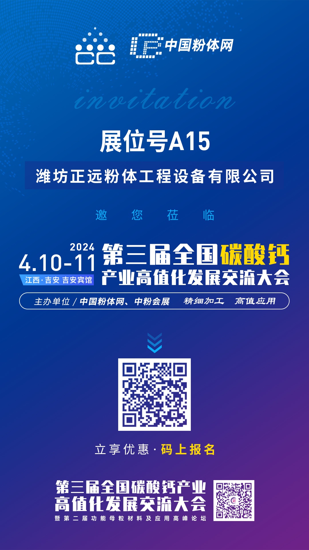 由中國粉體網主辦的“2024第三屆全國碳酸鈣交流會”將于2024年4月10-11號在江西吉安舉辦,濰坊正遠粉體工程設備有限公司邀您一同參加。