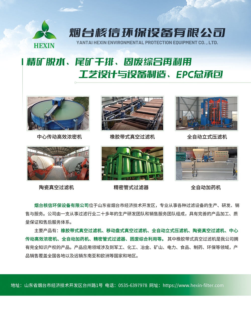 主要產品有;檢膠帶式真空過濾機、移動盤式真空過濾機、全自動立式壓濾機、陶資真空過淡機、中心傳動高效濃密機、全自動加藥機、精密管式過濾器、固康綜合利用等。 其中橡膠帶式真空過端機是我公司擁有完金知識產權的產品。產品應用領域涉及到軍工、化工、冶金、礦山、電力、食品、制藥、環(huán)保等領域,產品銷售覆蓋全國各地以及遠銷東南亞和歐洲等國家和地區(qū)。