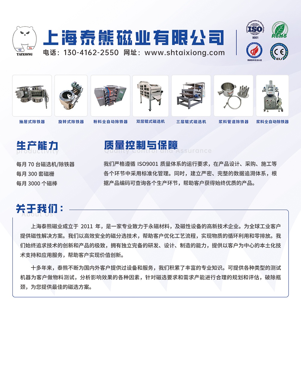 上海泰熊磁業有限公司是專業從事磁性材料的研發、生產、加工、銷售為一體的生產型企業。經過多年的市場歷練,泰熊已經在磁性事業上踏上了新的征程。公司產品跨四大領域十四大系列,從橡膠磁材到受磁材料,逐步擴展到磁性廣告材料、磁性制品等領域,從片狀膠磁、卷狀膠磁系列到磁性漆、電梯磁、磁性廣告、冰箱貼磁等系列。 公司通過不斷的引進專業人才和先進技術 ,與國內外朋友廣泛合作,共同研制、開發生產,滿足廣大用戶的需求。產品已經深受國內外市場客戶的青睞。在客戶中樹立了良好的口碑形象。