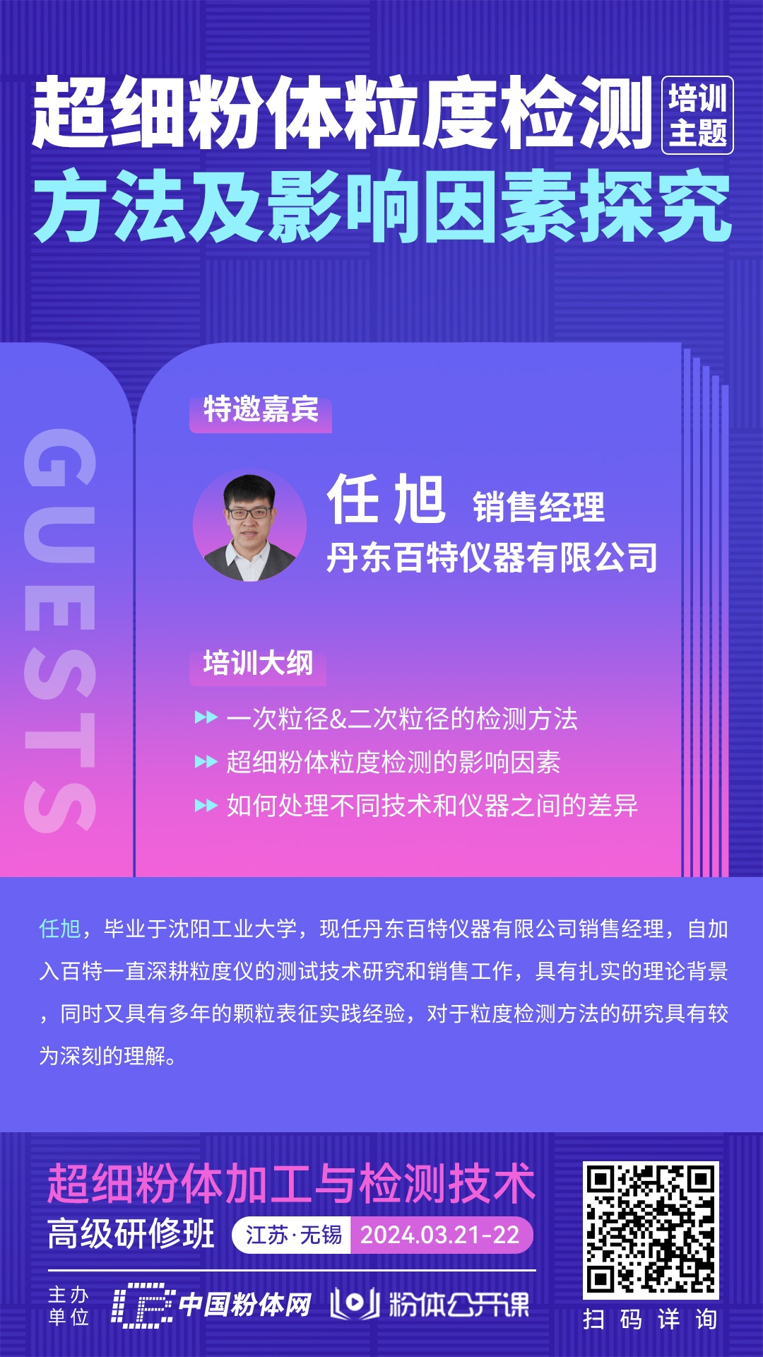 本次培訓(xùn)班特邀丹東百特儀器有限公司任旭銷(xiāo)售經(jīng)理帶來(lái)《超細(xì)粉體粒度檢測(cè)方法及影響因素探究 》!歡迎大家積極報(bào)名參會(huì)學(xué)習(xí)!