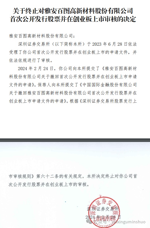中國粉體網訊 2024年2月24日,雅安百圖高新材料股份有限公司申請撤回發行上市申請文件。2月28日,深交所決定終止對其首次公開發行股票并在創業板上市的審核。