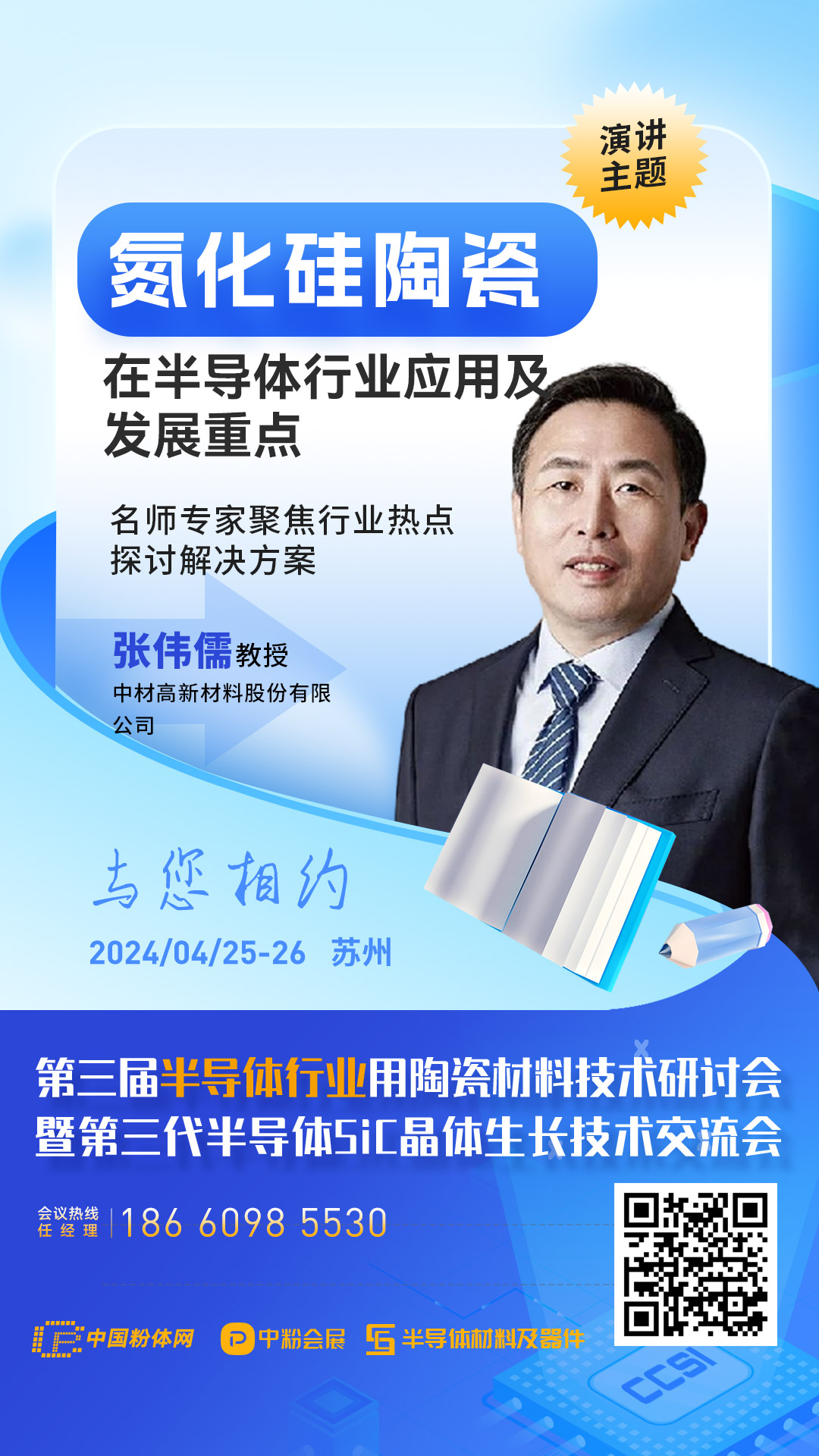 中國粉體網將于2024年4月25日在江蘇蘇州舉辦“第三屆半導體行業用陶瓷材料技術研討會暨第三代半導體SiC晶體生長技術交流會”,屆時,中材高新材料股份有限公司張偉儒教授將帶來題為《氮化硅陶瓷在半導體行業應用及發展重點》的報告。張教授將針對行業對氮化硅陶瓷零部件需求,重點論述了高導熱氮化硅陶瓷基板國內外研究、產業化及應用進展。