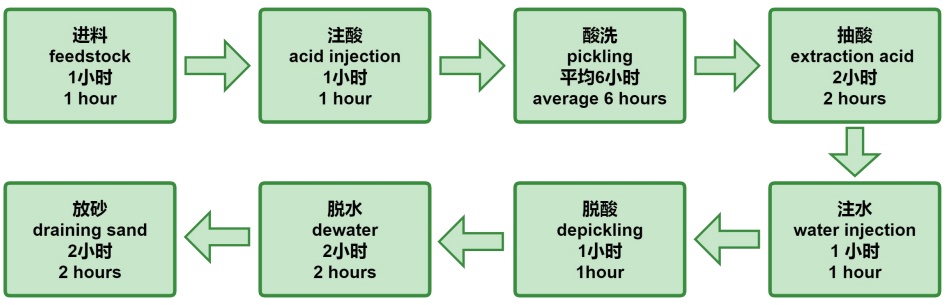 根據酸洗流程圖可知,酸洗石英砂酸洗分為八個主要流程,全過程約為16小時,其中酸洗是耗時最長的也是最舉足輕重的一個步驟。