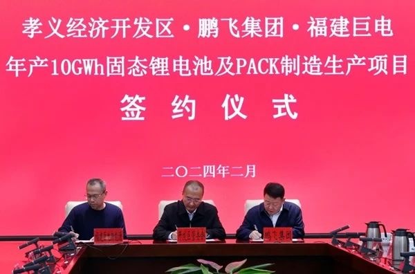 中國粉體網訊 2月29日,山西孝義經濟開發區管委會、山西鵬飛集團有限公司(簡稱:鵬飛集團)、福建巨電新能源股份有限公司(簡稱:福建巨電)舉行年產10GWh固態鋰電池及PACK制造生產項目簽約儀式。