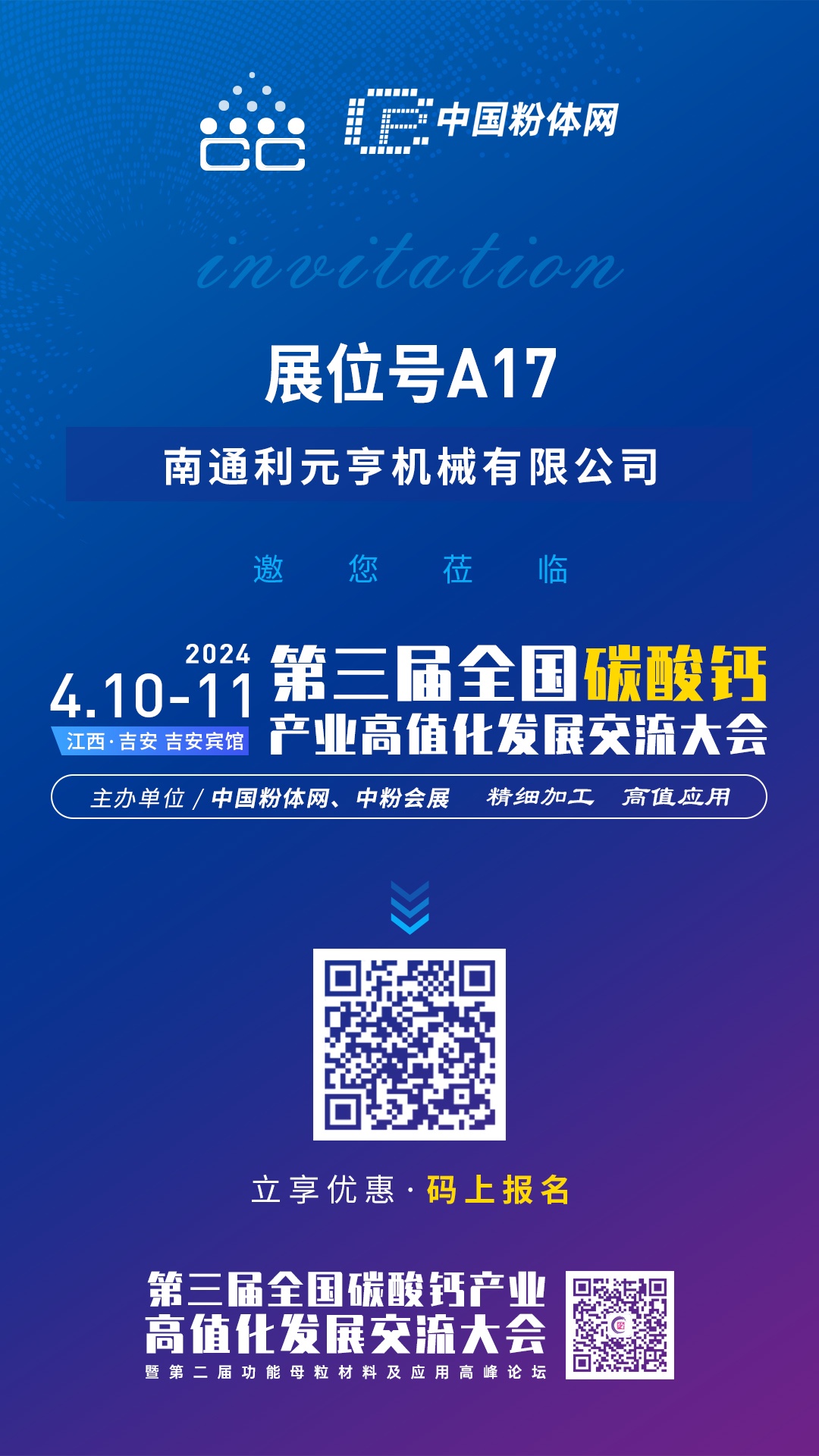 由中國粉體網主辦的“2024第三屆全國碳酸鈣交流會”將于2024年4月10-11號在江西吉安舉辦,南通利元亨機械有限公司邀您一同參加。