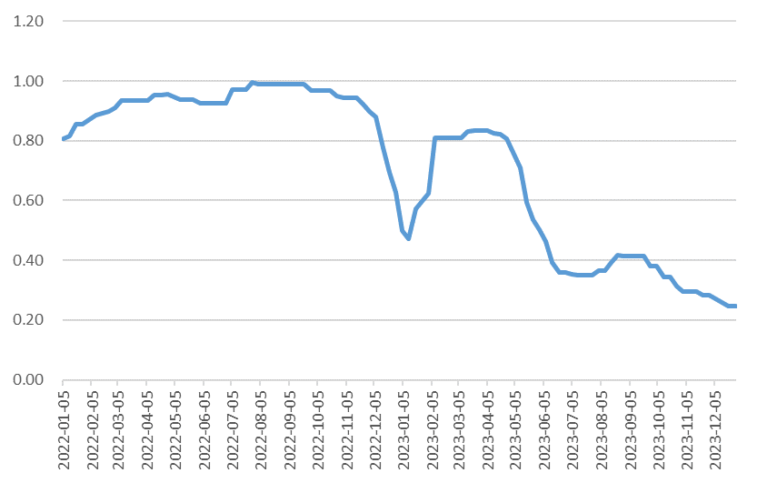 2022年-2023年中國單晶硅片(182mm/165μm)現貨價格(平均價)走勢圖(單位:美元/片)