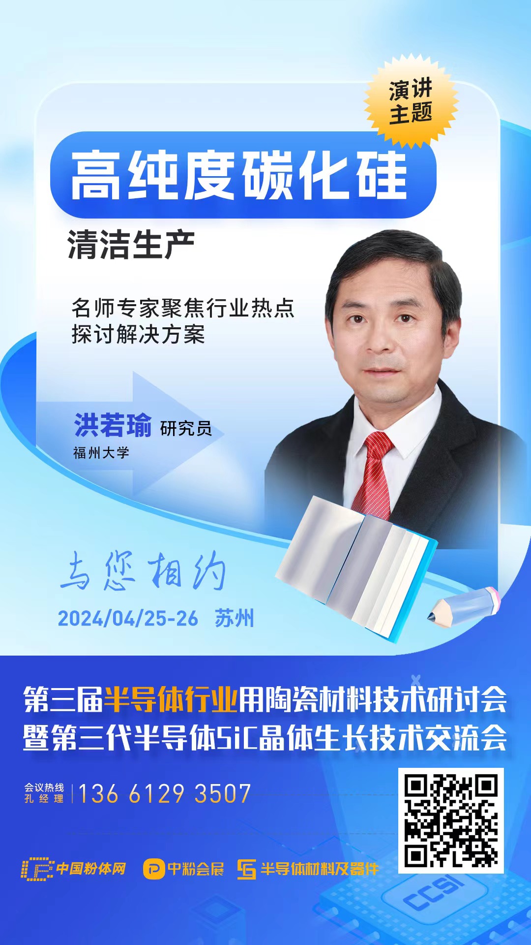 中國粉體網(wǎng)將于2024年4月25日在江蘇蘇州舉辦“第三屆半導體行業(yè)用陶瓷材料技術研討會暨第三代半導體SiC晶體生長技術交流會”,屆時,福州大學洪若瑜教授將帶來題為《高純度碳化硅清潔生產(chǎn)》的報告。洪教授基于碳化硅粉體的特性、應用領域,將詳細介紹碳化硅粉體的制備方法,并對各種方法進行評述。