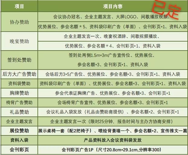 協(xié)辦贊助、晚宴贊助、大屏廣告、椅背廣告贊助、茶歇贊助、胸牌贊助、禮品贊助……
