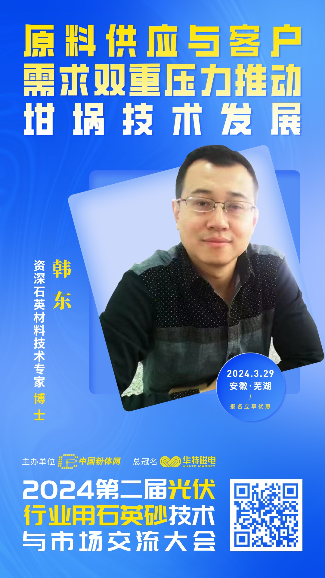 2024年3月29日,由中國粉體網(wǎng)主辦的“2024第二屆光伏行業(yè)用石英砂技術(shù)與市場交流大會”將在安徽蕪湖召開,資深石英材料技術(shù)專家韓東博士將做《原料供應(yīng)與客戶需求雙重壓力推動坩堝技術(shù)發(fā)展》的報告,屆時,他將從高純石英砂原料供應(yīng)以及光伏下游技術(shù)迭代兩方面深度解析石英坩堝行業(yè)的發(fā)展。