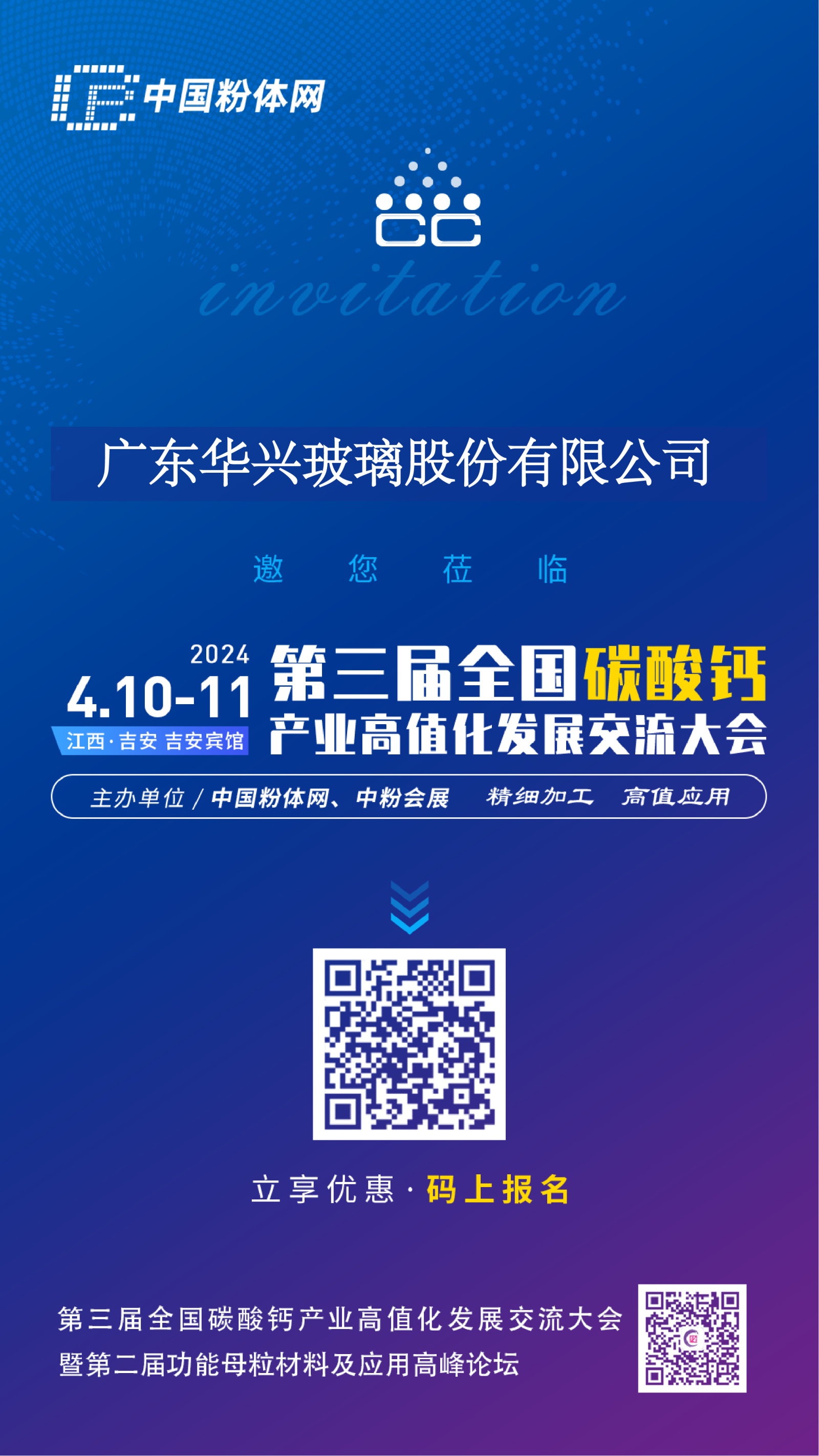 由中國粉體網(wǎng)主辦的“2024第三屆全國碳酸鈣交流會(huì)”將于2024年4月10-11號(hào)在江西吉安舉辦,廣東華興玻璃股份有限公司邀您一同參加。