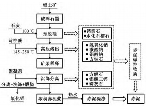 赤泥中的鐵含量為5%~50%,在赤泥中主要存在于赤鐵礦、褐鐵礦和針鐵礦等礦物中,對于赤泥回收鐵的主要方法有磁選法和濕法冶金等;赤泥中的鋁含量為4%~30%,在赤泥中主要存在于一水硬鋁石和三水鋁石等礦物中,對于赤泥回收鋁的主要方法有“鈣化-碳化”法和濕法冶金等。