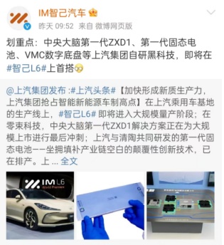 中國粉體網訊 3月12日,上汽集團通過官方微博宣布,智己L6將在上汽乘用車基地的生產線上進入大規模量產階段。同時,上汽與清陶能源共同研發的第一代固態電池也已開始排產。