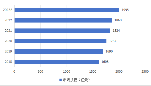 受益于5G通信、消費電子、汽車電子等領域的需求釋放,全球電子陶瓷市場保持持續(xù)增長。2018年全球電子陶瓷市場規(guī)模約為1608億元,2022年全球電子陶瓷市場規(guī)模約為1860億元,2018-2022年間以3.7%的年復合增長率實現(xiàn)穩(wěn)健增長。2018-2023年全球電子陶瓷市場規(guī)模如圖3所示。