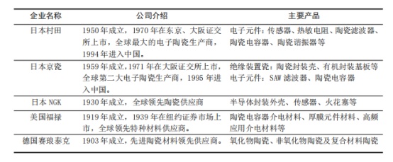 目前,全球電子陶瓷生產(chǎn)廠商主要參與者有日本村田制作所(簡稱日本村田)、日本京瓷株式會社(日本京瓷)、日本德山株式會社(德山化工)、日本住友化學工業(yè)株式會社(住友化學)、日本特殊陶業(yè)株式會社(NGK)、美國福祿公司、德國賽瑯泰克集團等。國外部分重點電子陶瓷企業(yè)如表2所示。