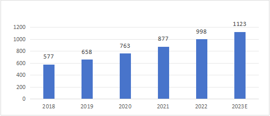 圖9 2018-2023年中國汽車電子市場規(guī)模(單位:億元)