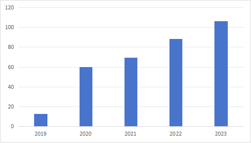 圖8 2019-2023年中國新增5G基站個數(shù)(單位:萬個)